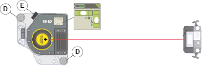 . - Verwenden Sie den Knopf zur Feinjustierung [E] (in der App hervorgehoben) am Lasersender um den Laserstrahl horizontal innerhalb von 0,5 mm auf den Detektor zu zentrieren. Der Detektor darf nicht berührt werden. Tippen Sie auf