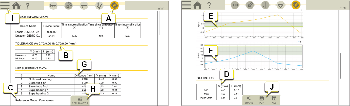 The report covers all details from the measurement. The report is constantly being filled out while the session is carried out. To see the report at its current state, tap