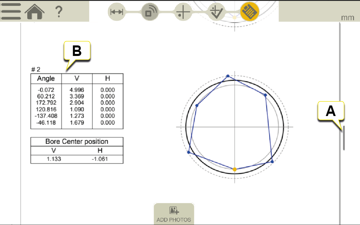Table with bore positions and measurement values, Vertical and Horizontal.