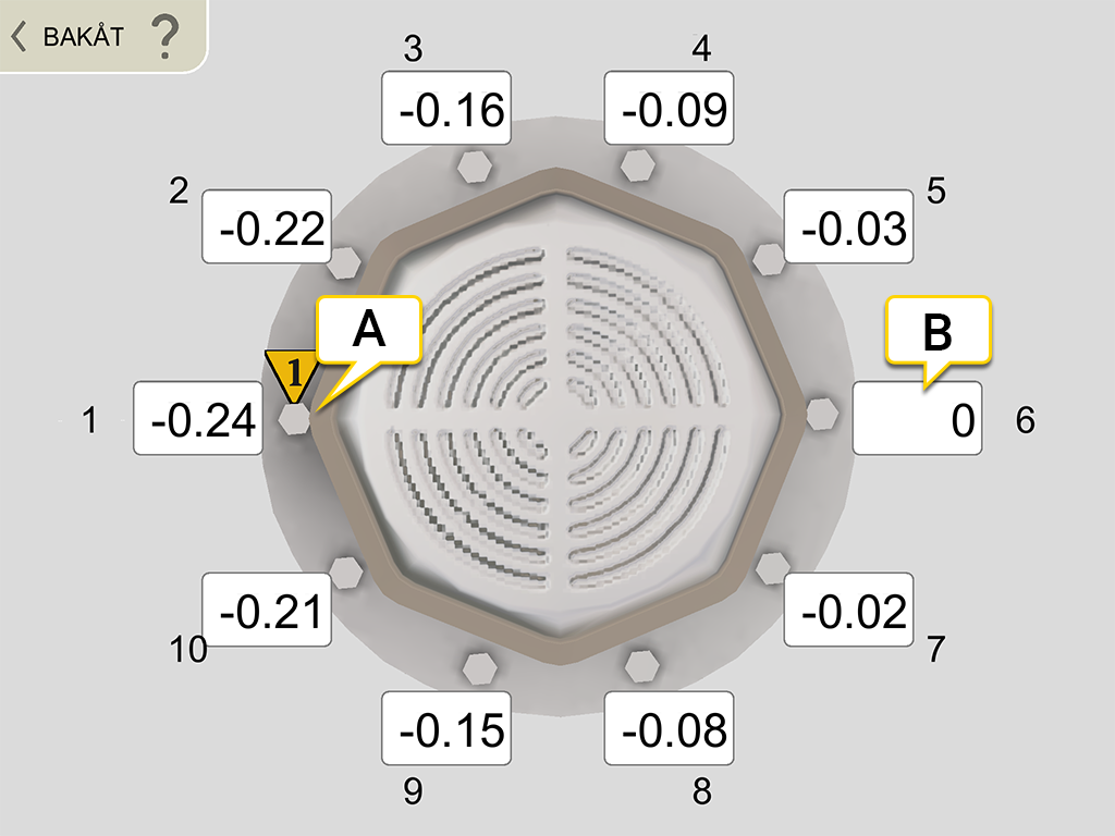 to open Shim value view. The values are not live. - Read the values. The highest bolt is calculated as 0.00. Values below zero indicates that the bolt is low and need shimming.