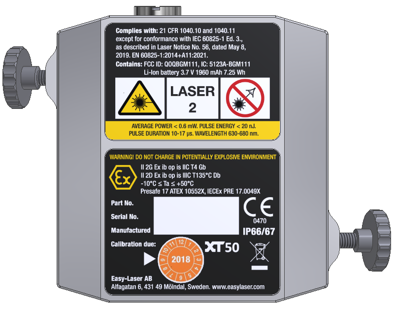 - La clasificación EX solo es válida para las unidades de medición XT50 (referencias 12-1026 y 12-1027). Los soportes, los elementos de fijación, el maletín y los demás accesorios no están sujetos a ninguna clasificación EX; el usuario debe evaluar su idoneidad antes de utilizarlos en entornos EX. Easy-Laser no asume ninguna responsabilidad por la seguridad EX de los accesorios.