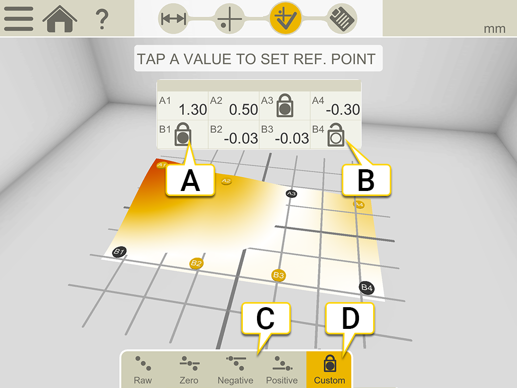 Los valores de la medición se pueden recalcular de modo tal que cualquiera de los tres pase a ser una referencia cero, aunque no puede haber más de dos alineados en horizontal o vertical en el sistema de coordenadas. (Si hay tres seguidos es una línea, no un plano). Los puntos de referencia hacen falta cuando se va a mecanizar la superficie.