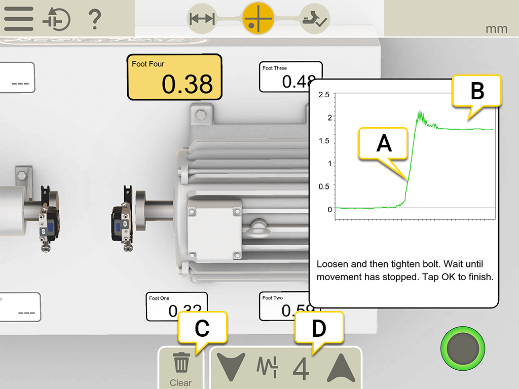 - Desserrez le boulon et attendez un mouvement. Vérifiez sur le graphique si la valeur s’est stabilisée.