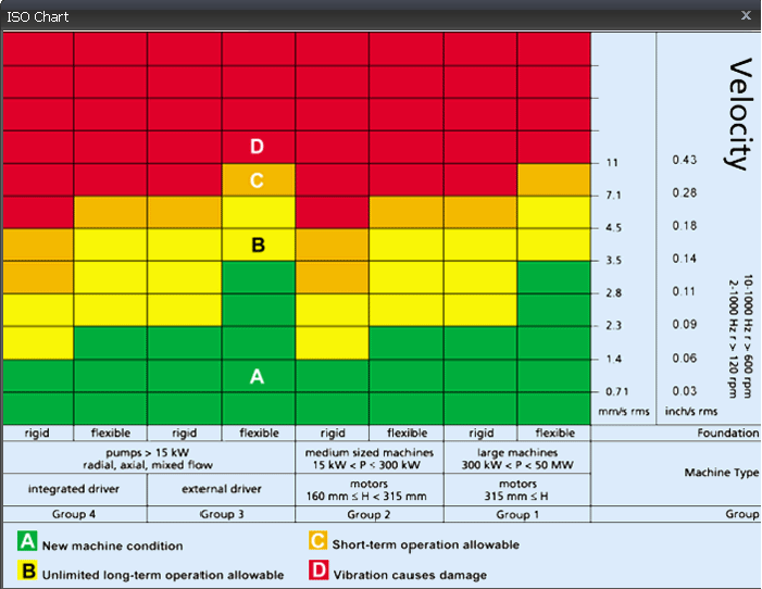 La valeur ISO (en mm/s ou in/s) est la valeur RMS (moyenne) de la vitesse de vibration dans la bande de fréquence de 10 Hz (600 tr/min) à 1 kHz (60 000 tr/min) ou de 2 Hz (120 tr/min) à 1 kHz (60 000 tr/min), comme spécifié dans la norme ISO. L’unité XT280 sélectionne automatiquement la bande de fréquence appropriée selon la vitesse de fonctionnement. Le fond s’affiche selon un code couleur conforme au tableau des niveaux de vibration de la norme ISO 10816-1 (voir ci-dessous). La couleur indique l’état de la machine en fonction de la taille et du type sélectionnés. Accédez à Configuration.