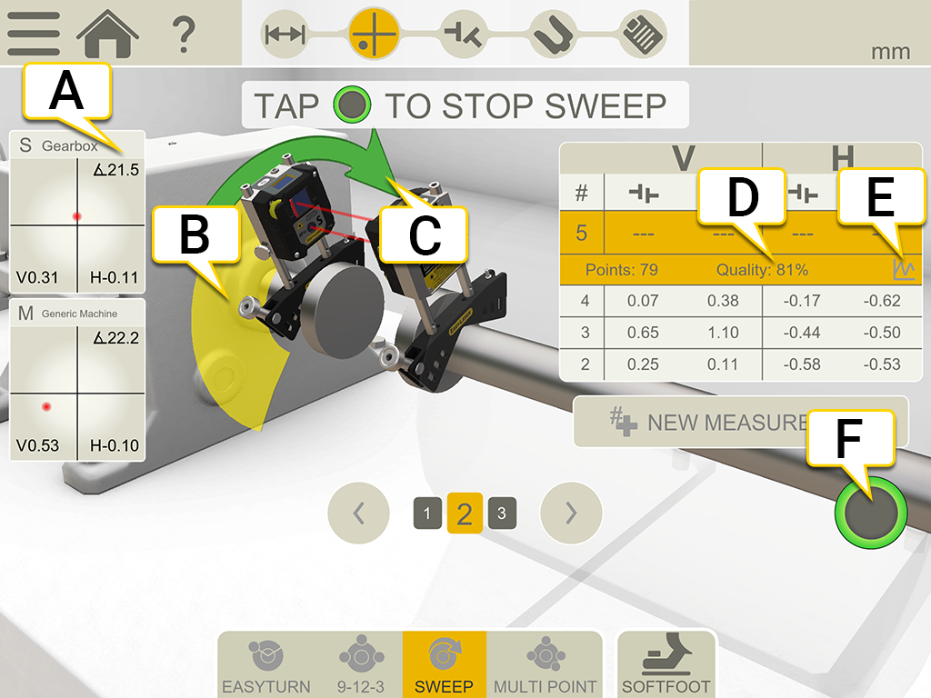 para iniciar a medição. - Gire os eixos. Gire os eixos o máximo possível para um resultado mais exato.