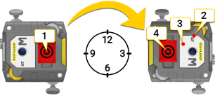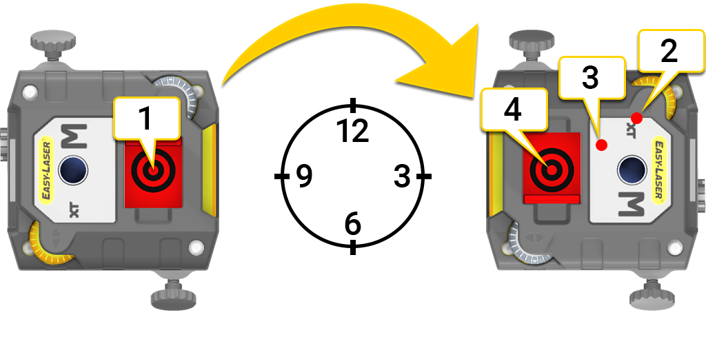 - Установите измерительные блоки в положение на 9 часов. Направьте лазерные лучи в центры мишеней.