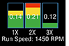На дисплее отображается уровень вибрации в частотных диапазонах, которые кратны (1X, 2X и 3X) указанной скорости работы машины, как показано ниже на трех гистограммах.