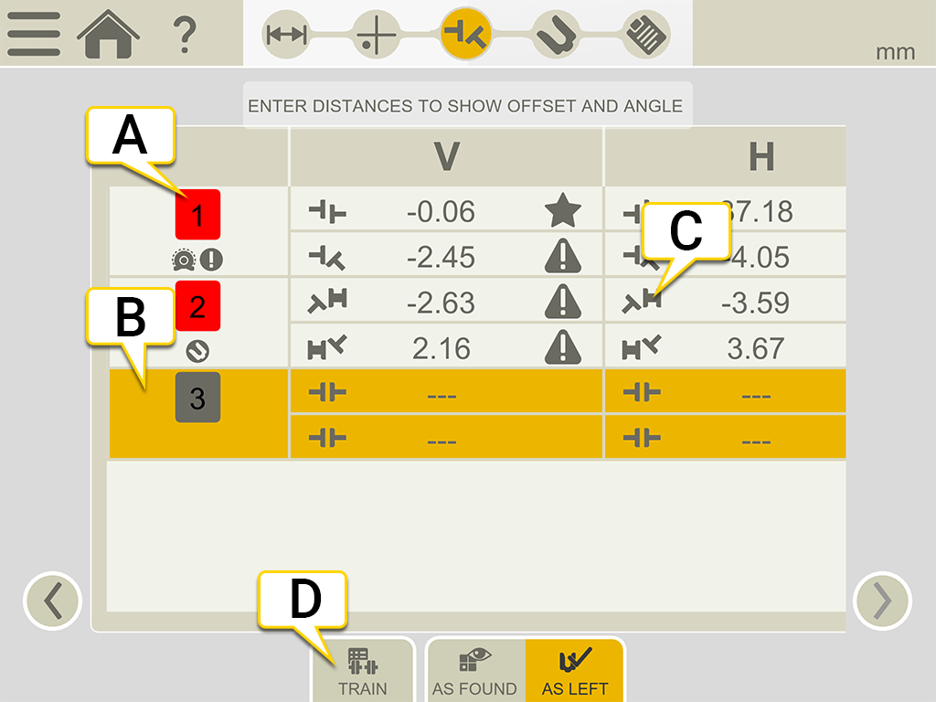 Osäker koppling. När du har justerat en koppling kan det påverka nästa koppling i maskintåget. Den här kopplingen behöver mätas igen. |
