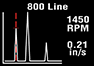 การกดปุ่มลูกศรลงจะเพิ่มความละเอียดของแกนความถี่จาก 100 เส้น (คือ ความละเอียด 10Hz หรือ 600 RPM) ถึง 800 เส้น (คือ ความละเอียด 1.25Hz หรือ 75 RPM) การเพิ่มความละเอียดจะซูมเข้าไปในสเปกตรัมความถี่ได้อย่างมีประสิทธิภาพ ในการแสดงสเปกตรัมเต็มรูปแบบที่ความละเอียดที่สูงขึ้น ต้องเลื่อนการแสดงผลโดยใช้ปุ่มลูกศรซ้ายและขวา