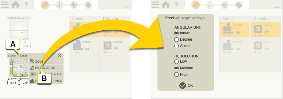 İçerik menüsünü açmak için Canlı Cihaz Görünümüne basın ve "HASSASİYET" seçeneğine basın. XT20/XT22 için açısal birimi ve hassasiyeti (ondalık sayısı) ayarlayın. XT20/XT22 ölçüm ekranındaki açısal birim ve hassasiyet, uygulamadaki ayarlarla aynı olacaktır.