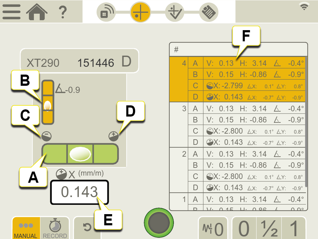 - 已记录值(精密水平仪 X/俯仰值,倾斜仪 X/俯仰值,倾斜仪 Y/横摆值)。