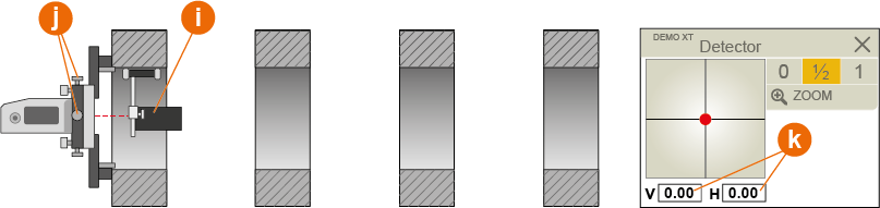 - 将探测器旋转 180º [i],然后点击 ½ 将该值减半。使用偏移集线器调整螺钉 [j] 调整激光发射器,直到激光束击中 0 值 [k]。