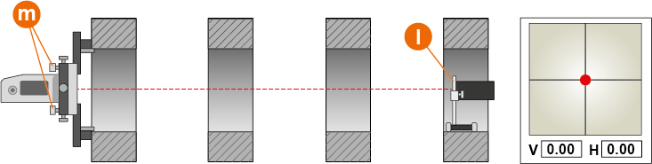 - 将探测器移动到 2 号设置孔中心位置 [l]。使用千分尺调整螺钉 [m] 将激光束的角度调整到 0 值。