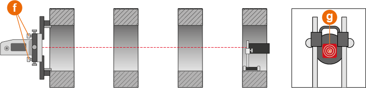 - 使用千分尺调整螺钉 [f] 调整激光束的角度,直到激光束击中探测器目标的中心 [g]。