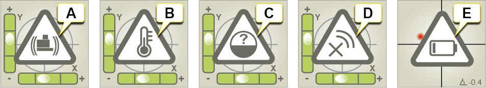 - 激光发射器的晃动警告。通过在 XT 应用程序中选择晃动警告“关闭”可将其停用。如果振动强度足以导致测量期间出现晃动警告,请从 XT 应用程序中提高电子水平仪的筛选级别。
