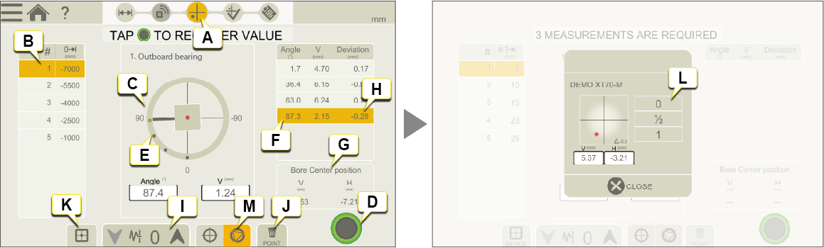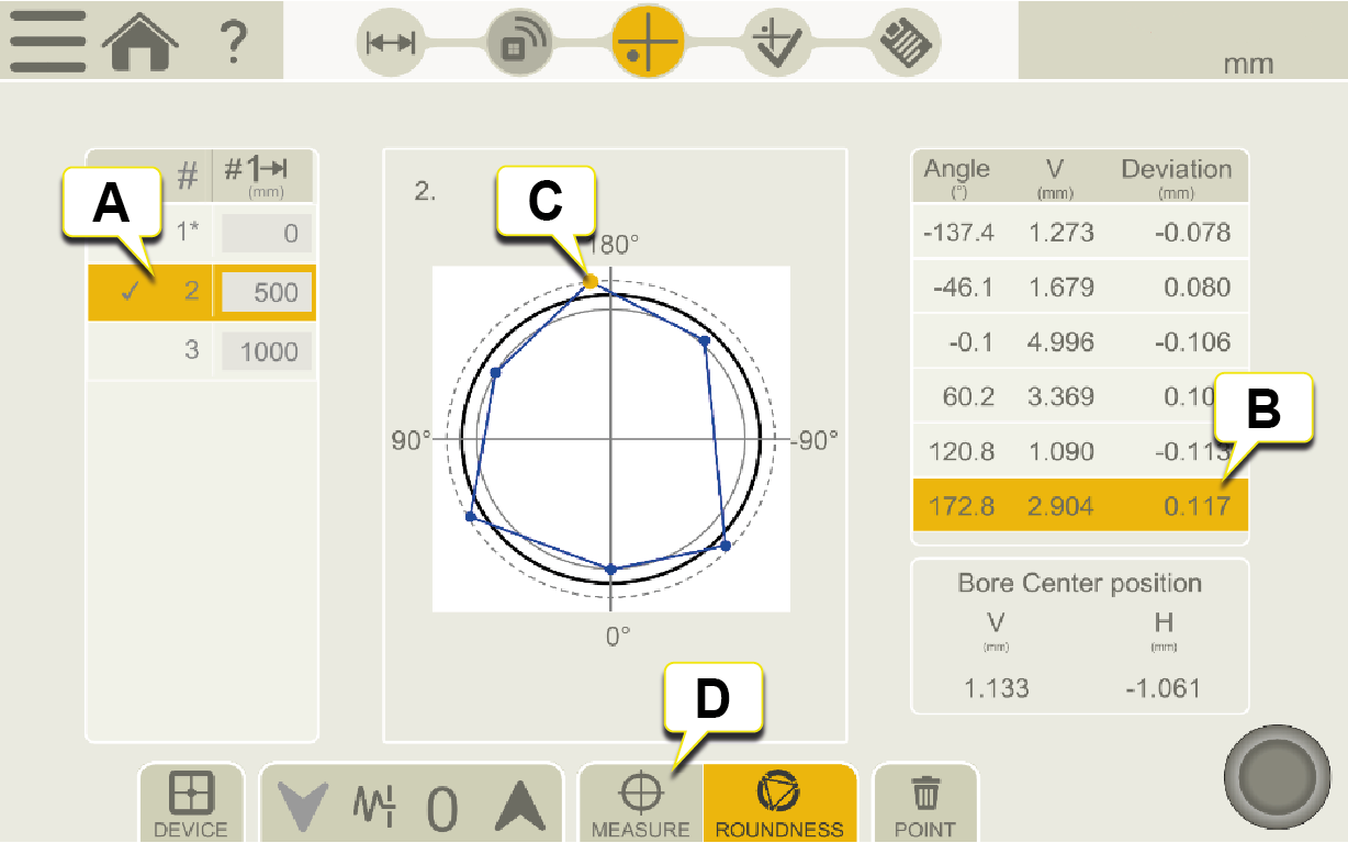 记录测量值,请参见下面的“测量”视图,然后为每个测量点记录一个新值。记录至少 3 个测量点。该程序现在计算孔中心位置的垂直值和水平值。