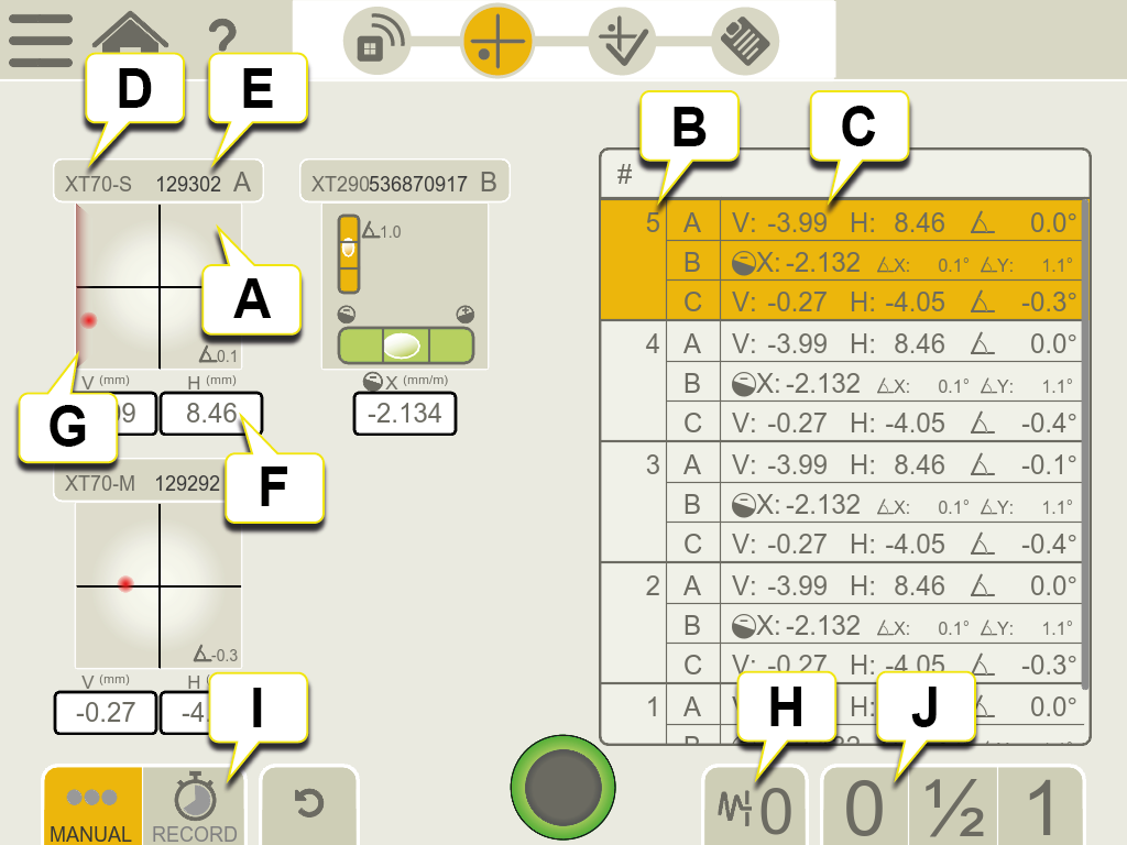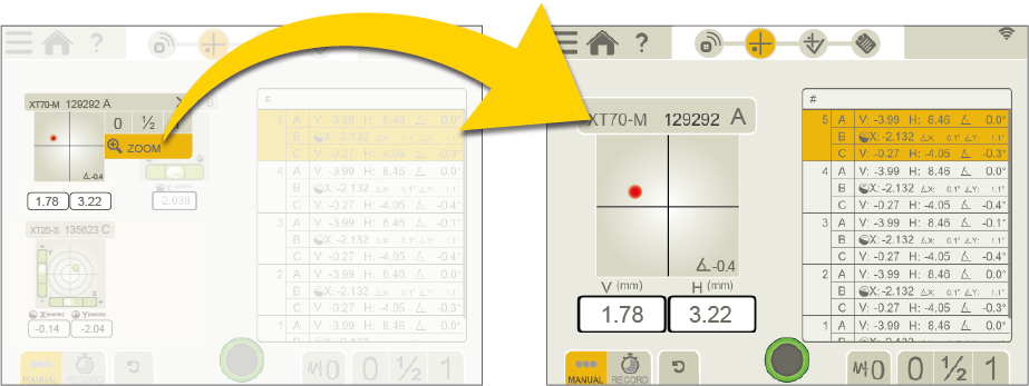 点击“实时设备视图”打开上下文菜单。在上下文菜单中,可以放大设备信息,将所选探测器实时读数的设置值减半或归零。在这里,还可以为精密级 XT290 和激光发射器 XT20/XT22 设置角度单位和精度。转到 测量