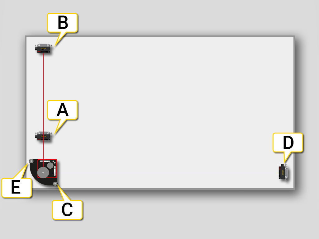 - 使用傾斜臺上的螺絲 E 調整雷射光束。調平為 ± 0.1 mm。