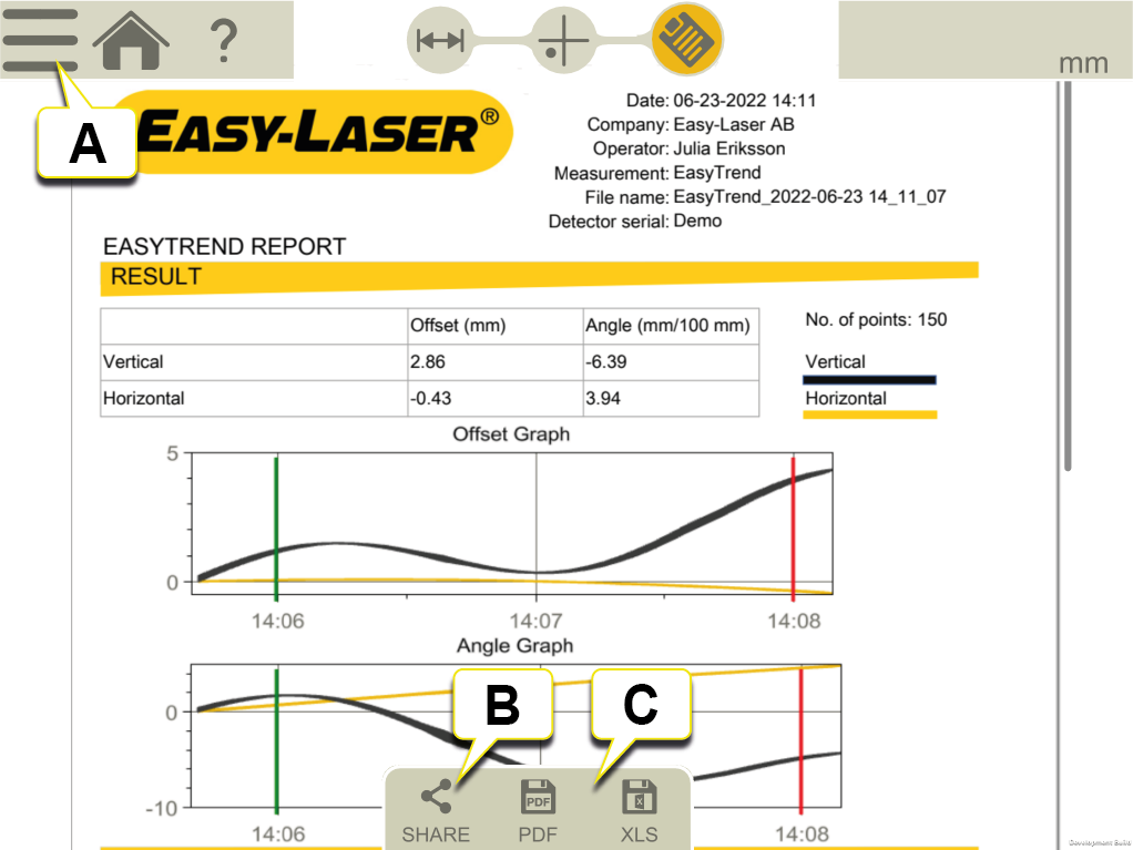 另存為 Pdf 或 Excel 檔案。檔案隨即儲存於檔案總管。「共用」和「另存為 Pdf 或 Excel 檔案」功能可在量測完成後使用。