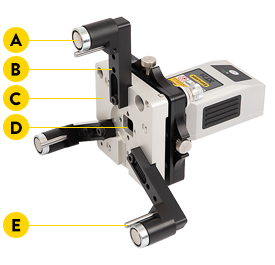 La conception rigide des émetteurs laser garantit la plus grande précision de mesure. Le support est doté de trois ensembles de bras réglables avec des aimants pour s'adapter à différents diamètres. Les bras peuvent être montés par incréments de 120° dans un alésage complet ou les trois vers le bas dans un demi-alésage. L'émetteur peut être monté de manière à orienter le faisceau laser à distance du moyeu décalé ou à travers lui.